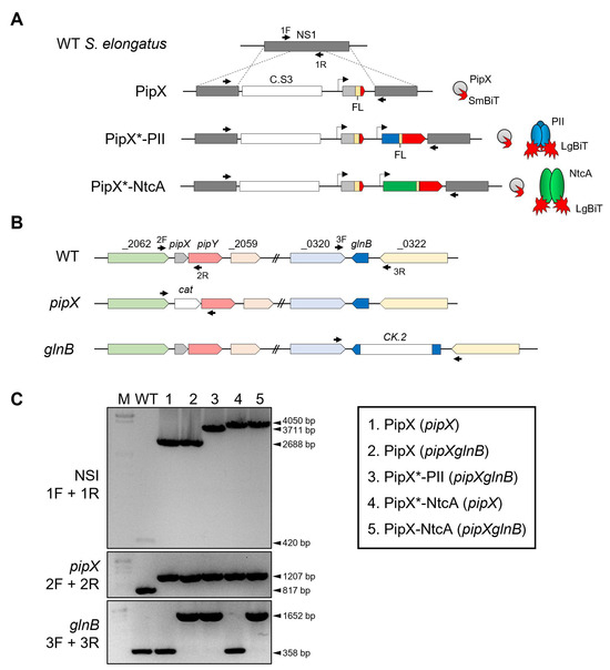 NanoBiT constructs and strategy used to analyse the PipX-PII and PipX-NtcA interactions in S. elongatus. (A) The NSI region and derivatives containing the C.S3 selection marker and the corresponding gene fusions are schematically illustrated, with the relevant products depicted to the right. * refers to PipX or PipXY6A. (B) Schematic representation of the pipX and glnB alleles. (C) Left panel: PCR analysis indicating the primers, depicted as black arrows, in (A,B) and the size of bands at the left and right, respectively. M: λ EcoRI/HindIII size marker. Right panel: strains analysed. See text for additional details.