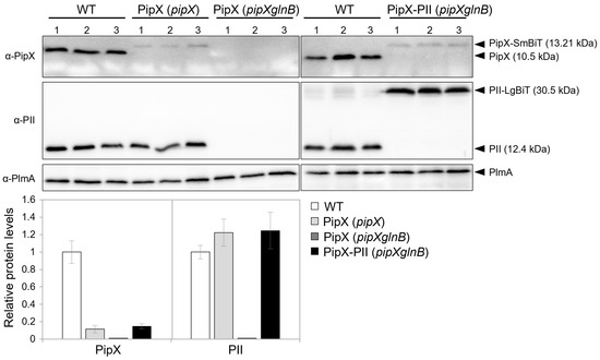 Western blots with anti-PipX or anti-PII antibodies were carried out using the PipX control or PipX-PII reporter constructs in S. elongatus and its mutant derivatives. As shown in Figure 2, both PipX-SmBiT and PII-LgBiT were detected in the pipXglnB double mutant carrying the PipX-PII reporter construct. While PII-LgBiT was detected at roughly the same levels as PII in the WT strain, the signal detected for PipX-SmBiT was about 15% that of PipX in the WT strain, suggesting that the SmBiT fragment decreases the levels of PipX and/or its affinity for the anti-PipX antibody. Importantly, PipX-SmBiT was detected in the pipX strain but not in the pipXglnB strain, thus providing direct evidence of the importance of PII for PipX levels in S. elongatus.