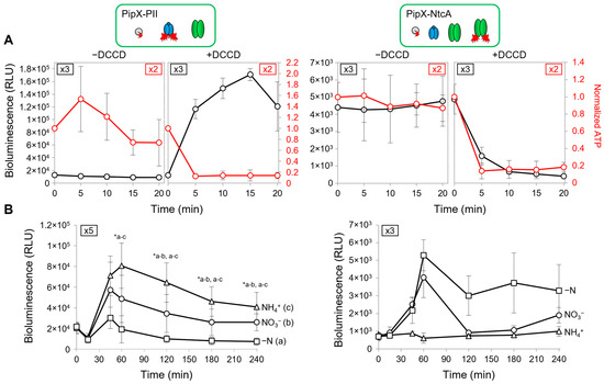 Real-time responses of PipX-PII and PipX-NtcA reporters to changes in energy levels and nitrogen sources. Reporter strains are indicated, and relevant proteins illustrated on top of the corresponding results. (A) Bioluminescence signals (black scale and curves) and normalized ATP levels (red scale and curves) from cultures grown with BG11 in the presence or absence of 200 µM DCCD. (B) Bioluminescence signals after transfer to the indicated nitrogen regimens. Data in (A,B) are presented as means with error bars (standard deviation) due to the indicated number of biological replicates (top rectangles) performed in each case. Wilcoxon rank-sum tests between the indicated comparisons produced p-values < 0.05 (*). (a–c) refer to the indicated nitrogen conditions.