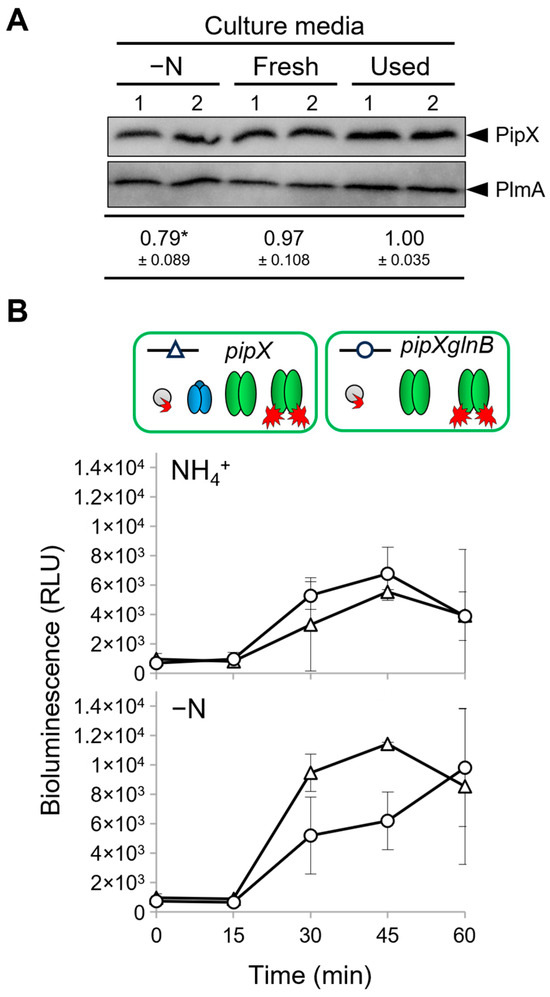 Regulation of PipX levels and PipX-NtcA interactions by PII in response to nitrogen deprivation. (A) Representative immunodetection and relative levels of PipX (PipX) from S. elongatus cultures after two centrifuge/washing steps with BG110 (-N), BG11 (Fresh) or the same BG11 supernatant (Used), normalised to the intensity shown in the same blot by endogenous PlmA, and respective to the “Used” values. Data are presented as means and error bars (standard deviation) from five biological replicates of two independent experiments. Wilcoxon rank-sum test produced p-values < 0.05 (*) (B) Real-time comparison of bioluminescence signals under the indicated nitrogen regimens at different times between the pipX (Δ) and pipXglnB (○) strains. Data are presented as means and error bars (standard deviation) from two biological replicates. Other details as in Figure 3.