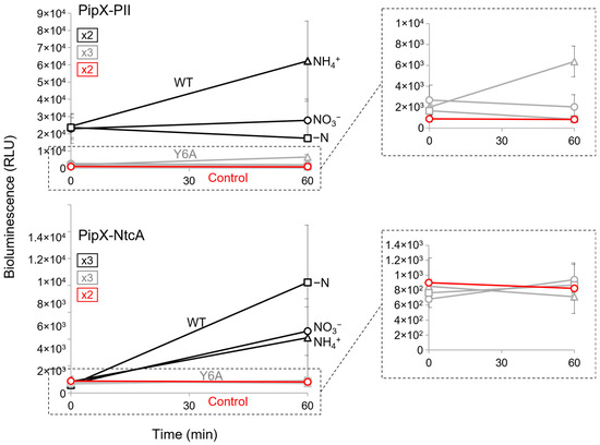 Impact of the mutation Y6A on PipX-PII and PipX-NtcA interactions. Bioluminescence signal of the indicated strains under different nitrogen regimen conditions at timepoints 0 and 60′. Black, grey, and red lines correspond to the WT or Y6A versions of the reporter and to the PipX control, respectively. Data are presented as means and error bars (standard deviation) from the indicated biological replicates (squares inside the graphics). Inset covers enlarge their corresponding regions.