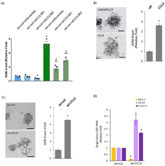 CCL9 was required for KrasG12D-induced pancreatic ADM and capable of driving ADM of the pancreas in 3D organoid culture system. (A) The isolated primary pancreatic acini of LSL-KrasG12D mouse were infected with adenovirus (ad-cre or ad-null/ctrl) and lentivirus (shCCL9 #1, shCCL9 #2 or shScramble/ctrl) and subject to ADM analysis. At the endpoint, the number of ADM structures under each condition was counted and analyzed as ADM events. *: p < 0.05 as compared to ad-null+ shScramble; **: p < 0.05 as compared to ad-cre + shScramble. (B,C) Primary pancreatic acini from wildtype mouse were treated with either recombinant CCL9 or ddH2O/ctrl (B) or infected with ad-CCL9 adenovirus or ad-null adenovirus (C) followed by the acinar-to-metaplasia assay in 3D as described in the Section 4 At the endpoint, the number of ductal structures were counted and analyzed as ADM events. Cells were also photographed to document the ADM event as shown. Arrow: ductal structure. *: p < 0.05 as compared to control. Scale bar: 50 µm. (D) At the endpoint, cells from (C) were isolated for and subject to RNA extraction, followed by real-time qRT-PCR for assessing Mist-1, CK-19 and mucin-1 transcripts. *: p < 0.05 as compared to ad-null.