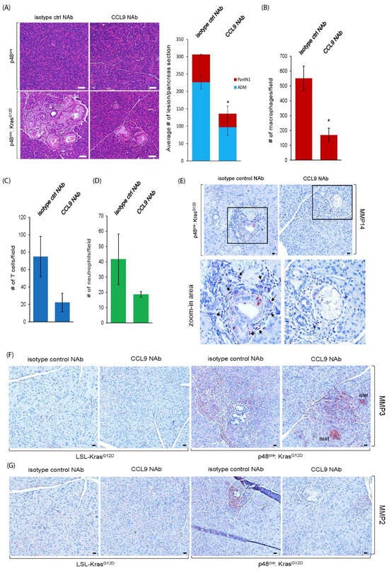 To investigate the effect of CCL9 inhibition in oncogenic Kras-regulated PDAC initiation, we treated p48cre:KrasG12D mice and their age-matched littermates with a specific CCL9 neutralizing antibody (CCL9 NAb) for 5 weeks. CCL9 NAb treatment reduced KrasG12D-mediated abnormal pancreatic structures, including ADM and PanIN lesions, as shown in the H&E stain (Figure 6A). A further detailed analysis of these structures indicated a 56% decrease in ADM and a 53% decrease in PanIN 1 lesions (Figure 6A). Our previous studies have shown a critical role of infiltrating macrophages in PDAC initiation [,,]. To test if blockade of CCL9 also affects infiltrating immune cells, especially macrophages, in KrasG12D-mediated PDAC initiation, we examined the infiltrating immune cells, including macrophages, T cells and neutrophils, in CCL9 NAb-treated pancreas tissues of p48cre:KrasG12D mice using immunohistochemistry (IHC) (Figure S5). A subsequent quantitative IHC analysis indicated CCL9 NAb significantly decreased infiltrating macrophages nearby the ADM regions (Figure 6B) instead of T cells and neutrophils (Figure 6C,D). Next, we evaluated if CCL9 NAb also impacted the levels of MMP14, MMP3 or MMP2, all of which were identified in our 3D organoid culture system (Figure 4E). As shown in Figure 6E and Figure S6, MMP14 was expressed in the ADM and surrounding immune cells of the pancreas in p48cre:KrasG12D mice. Treatment with CCL9 NAb significantly diminished the expression of MMP14 in KrasG12D-mediated pancreatic ADM regions. Similarly, CCL9 NAb treatment also reduced MMP3 and MMP2 levels in the ADM of the pancreas (Figure 6F,G).