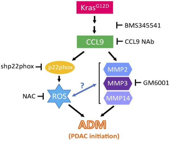 Summarized findings on how KrasG12D potentiates ADM via CCL9 and other downstream molecules to initiate PDAC. This diagram is depicted based on our findings from this study to demonstrate the mechanism that KrasG12D utilizes to initiate PDAC. ROS: reactive oxygen species; NAC: N-Acetyl Cysteine; MMP: matrix metalloproteinase; NAb: neutralizing antibody; ADM: acinar-to-ductal metaplasia. Question mark: requires further scientific evidence.