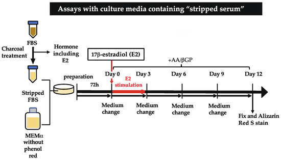 Bone formation is regulated by the activation/inhibition of various signaling pathways and signaling molecules [5]. There are many reports on estrogen action in bone-forming cells [10,11,12,13,14]. However, according to the previous reports, the culture medium used in vitro assays in some studies were constructed with αMEM and FBS, which contain a detectable amount of E2 and other estrogens. By using FBS, the exact effects of estrogen may not be able to be examined in detail. The “stripping” of serum is a common technique in the research area of endocrinology. Using this method, estrogens and other lipophilic hormones, which may also synergistically affect estrogen-mediated pathways, such as progesterone, can be eliminated (Supplementary Figure S1), thus enabling us to examine the true estrogen action. By using stripping serum, we were able to detect a novel E2-mediated signaling pathway in the matrix mineralization of bone-forming cells.