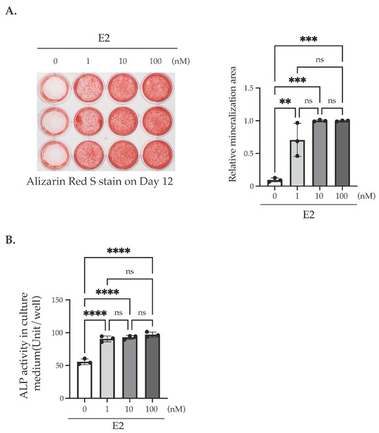 The effect of E2 treatment on the matrix mineralization of MC3T3-E1 cells. (A) A representative showing the matrix mineralization assay. Cells were cultured in the media with AA/βGP and cultured for 12 days. The indicated amount of E2 (1–100 nM) was added at Day 0 until Day 3. The cells were fixed and stained using Alizarin red S to determine the matrix mineralization level. The quantification results are shown in the right panel. (B) ALP assay. ALP activities in the culture medium on Day 12 of the cells being stimulated with/without E2 (1–100 nM) for 3 days (Day 0–Day 3). Data presented as mean ± SD (n = 3) are representative of at least three independent experiments. ** p < 0.01, *** p < 0.001, and **** p < 0.0001 versus control (no E2) using Bonferroni’s test. ns: not significant.