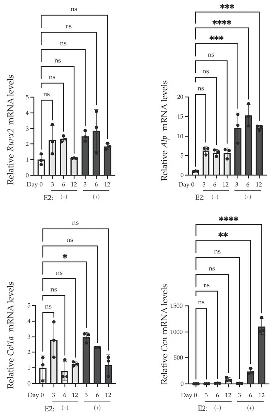 Changes in the mRNA levels of the substance responsible for ossification via E2 treatment. Quantitative RT-PCR analysis for Runx2, Alp (Alpl), Col1a, and Ocn (Bglap) mRNA. mRNA was isolated from MC3T3-E1 cells on the indicated day. E2 (10 nM) was treated for 3 days (Day 0–Day 3). The relative mRNA levels of Runx2, Alp (Alpl), Col1a, and Ocn (Bglap) were normalized to the expression of Rpl13a. Data presented as mean ± SD (n = 3) are representative of at least three independent experiments. * p < 0.05, ** p < 0.01, *** p < 0.001, and **** p < 0.0001 using Bonferroni’s test. ns: not significant.