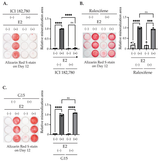 The effect of ER or GPER antagonists on matrix mineralization. (A–C) MC3T3-E1 cells were treated with/without 10 nM E2 and 100 nM ICI182,780, 100 nM G15, or 100 nM Raloxifene for 3 days (Day 0–Day 3). The cells were fixed and stained with Alizarin red S on Day 12 to determine the matrix mineralization level. The quantification results are shown in the right panel. Data presented as mean ± SD (n = 3) are representative of at least three independent experiments. *** p < 0.001, **** p < 0.0001 using Bonferroni’s test. ns: not significant.
