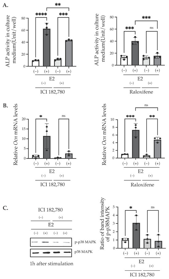 The effects of ER antagonists on ALP activity in the culture media, Ocn mRNA, and p38 MAPK phosphorylation. (A) ALP assay. ALP activities in the culture medium on Day 12 of the cells treated with/without E2 (10 nM) for 3 days (Day 0–Day 3) in the presence of 100 nM ICI182,780 or 100 nM Raloxifene for 3 days (Day 0–Day 3). (B) The quantitative RT-PCR analysis of Ocn (Bglap). Cells were stimulated with/without E2 (10 nM) in the presence of 100 nM ICI182,780, 100 nM Raloxifene, or not on Day 0. mRNA was isolated from MC3T3-E1 cells on Day 12. Relative mRNA expression was normalized with the expression of Rpl13a. (C) The Western blot analysis of whole-cell lysates with antibodies for phosphor-p38 MAPK (p-p38 MAPK) or total p38 MAPK. MC3T3-E1 were stimulated with/without 10 nM E2 and 100 nM ICI182,780 on Day 0. Cells were collected 1 h after stimulation. The quantification results are shown in the right panel. Data presented as mean ± SD (n = 3) are representative of at least three independent experiments. * p < 0.05, ** p < 0.01, *** p < 0.001, and **** p < 0.0001 using Bonferroni’s test. ns: not significant.