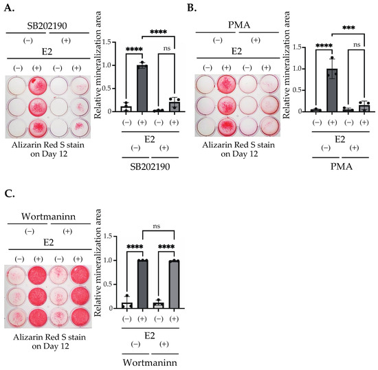 E2 induced matrix mineralization through the inhibition of the PKC pathway and the activation of p38 MAPK pathway. (A) Cells were stimulated with/without 10 nM E2 for 3 days (Day 0–Day 3) and cultured with/without (A) 500 nM Wortmannin, (B) 150 nM PMA, and (C) 10 µM SB202190 for 3 days (Day 0–Day 3). The cells were fixed and stained with Alizarin red S on Day 12 to determine the matrix mineralization level. The quantification results are shown in the right panel. Data presented as mean ± SD (n = 3) are representative of at least three independent experiments. *** p < 0.001, and **** p < 0.0001 using Bonferroni’s test. ns: not significant.
