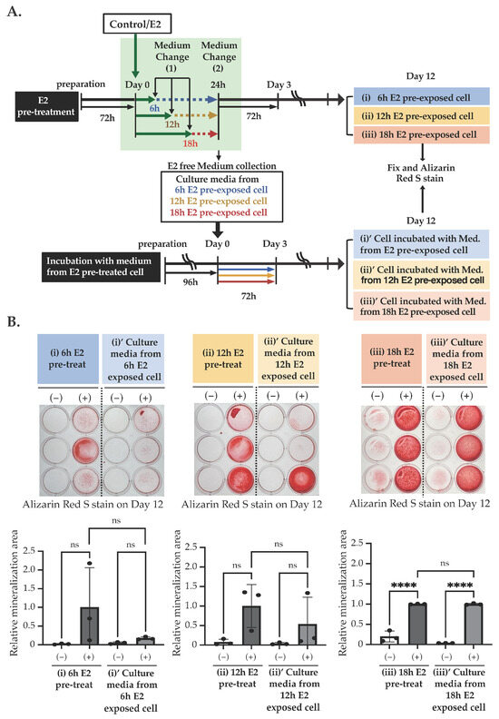 The effect of the culture media obtained from E2 pre-exposed cells on matrix mineralization. (A) The scheme of matrix mineralization assays used in the experiments are shown in this figure. (B) Matrix mineralization assay. MC3T3-E1 cells were treated with/without 10 nM E2 at Day 0 for 6 h, 12 h, or 18 h, followed by the E2-free medium replacement and incubated for 18 h, 12 h, or 6 h, respectively. Then, cells directly exposed to E2 for 6 h, 12 h, or 18 h (i, ii or iii, respectively) were fixed on Day 12. Cells treated with the culture medium obtained from the 6 h, 12 h, or 18 h pre-exposed cell (i’, ii’, iii’) were also fixed on Day 12. Then, cells were stained with Alizarin red S to determine the matrix mineralization level. Data presented as mean ± SD (n = 3) are representative of at least three independent experiments. **** p < 0.0001 using Bonferroni’s test. ns: not significant.