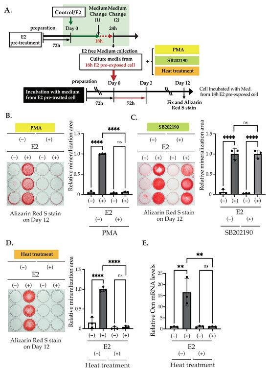 The effect of PKC activation, p38 MAPK inhibition, and heat treatment on matrix mineralization. (A) The scheme of matrix mineralization assays used in the experiments is shown in this figure. (B,C) Matrix mineralization assay. The culture media were collected from the cells pre-exposed with/without 10 nM E2 on Day 0 for 18 h of stimulation. MC3T3-E1 was incubated with the media from the 18 h E2 pre-exposed culture for 72 h in the presence of PMA or SB202190. On Day 12, the cells were fixed and stained with Alizarin red S. The quantification of their results is shown in the right graph. (D) Matrix mineralization assay. The collected media were treated with/without 95 °C for 3 min and centrifuged with 14,000× g, for 3 min at 4 °C. MC3T3-E1 was incubated with this collected media or the heat-treated media from the 18 h E2 pre-exposed culture for 72 h. On Day 12, the cells were fixed and stained with Alizarin red S. The quantification results are shown in the right panel. The (E) quantitative RT-PCR analysis of Ocn (Bglap). Cells were treated in the same way as in (D). mRNA was isolated from MC3T3-E1 cells on Day 12. Relative mRNA expression was normalized to the expression of Rpl13a. Data presented as mean ± SD (n = 3) is representative of at least three independent experiments. ** p < 0.01 and **** p < 0.0001 using Bonferroni’s test. ns: not significant.