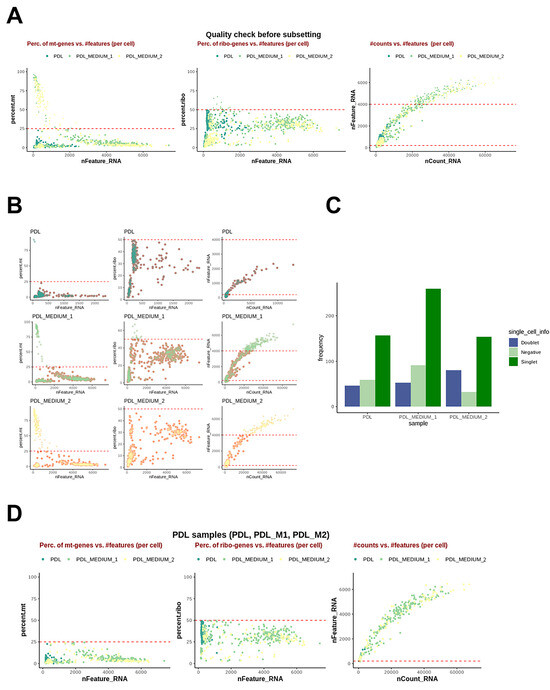 Figure 1. Quality control analysis for scRNA-seq data. (A) Combined overview of cells excluded and included for tissue samples of PDL, PDL cells cultured in serum-containing medium (PDL_M1), and PDL cells cultured in serum-free medium (PDL_M2). The left graph plots the percentage of mitochondrial genes in a cell (percent.mt), indicative of cell degradation and death, against the number of detected genes in this cell (nFeature_RNA). The center graph shows the percentage of ribosomal genes, related to cell cycle phases against the number of detected genes (nFeature_RNA). The right plots the number of detected genes (nFeature_RNA) against sequenced fragments (nCountRNA), highlighting potential doublets. (B) Sample quality before and after quality adjustment. Each dot represents a cell, with its position indicating the mitochondrial quality metrics. (C) Results of HTO demultiplexing, identifying demultiplexed singlet, doublets, and negative signal singlets. (D) Post-filtering status of PDL samples, showing the removal of doublets and other biased data to enhance the integrity of subsequent analyses.