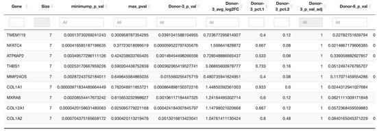 In the next step, a conservation analysis was performed across all donors, pooling all samples together, in order to identify the top 10 conserved markers sorted by the most conservative significance assumption (max_pval). Since cluster 0 was expressed in all donors and also contained the absolute majority of PDL cells, it was used to identify the genes of this complex that are conserved across all donors and thus represent the characteristic of this cluster. As exhibited in Figure 5, the most significantly conserved marker of cluster 0 was TMEM119, whose encoded Transmembrane Protein 119 is involved in the positive regulation of bone mineralization as well as osteoblast differentiation and proliferation. The other genes of interest were primarily COL1A1 and COL1A2, which encode type I alpha-1 collagen and type I alpha-2 collagen, with type I fibrillar collagen being the most abundant type of collagen in the body and COL12A1, whose protein is a type XII collagen and is responsible for cell adhesion, collagen degradation and collagen fibril organization, among other functions.