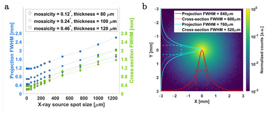 Figure 1a shows the relationship between the transversal FWHM (full width at half maximum) of the focused X-ray beam in air, estimated using projection and cross-sectional line profiles of the photon intensity distribution at the focal point mm and the FWHM of the X-ray source spot. A corresponding normalized photon intensity distribution is shown in Figure 1b for .