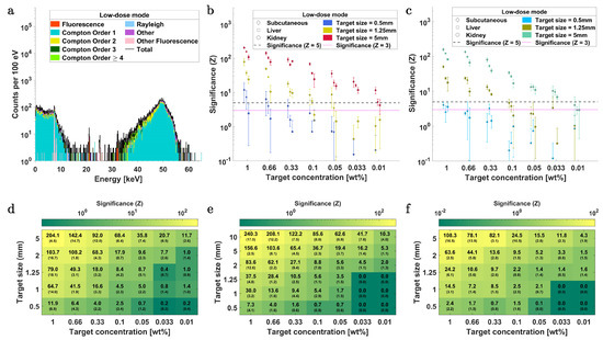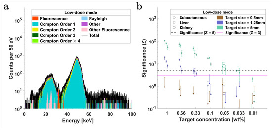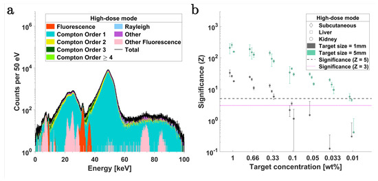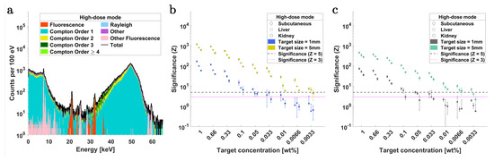 Figure 6a,b show the typical spectrum and significance (Z) for fluorescence in the high-dose mode. Simulations in the high-dose mode show improved significance (Z) for fluorescence, with values exceeding the threshold for both 1 mm and 5 mm diameter targets. Consequently, targets within all three organ regions demonstrated detection limits below wt% and wt% for 1 mm and 5 mm targets, respectively.