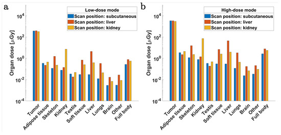 Comparison of organ doses across low-dose and high-dose mode fluorescence imaging. (a) Organ doses in the low-dose mode and (b) in the high-dose mode are shown for the three organ scan positions that include the tumor target, i.e., (blue) subcutaneous, (orange) liver, and (golden) kidney region. Herein, the tumor dose corresponds to a lesion size of 1 mm in diameter.