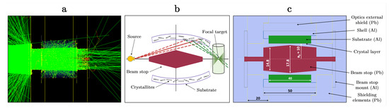 In our work, this assembly is enclosed inside an external optics shield composed of lead (Pb). A beam-stop made up of Pb and with dimensions shown in Figure 8c is used to block the direct passage of X-rays from the optical system. Two external shielding elements, composed primarily of Pb, secure the system, and the beam-stop is mounted using aluminum supports. The two external elements further serve as shields against the direct beam effects and also against other scattered events. This structure also collimates the primary beam, limiting the passage of X-rays to those necessary for interacting with the crystal layers.