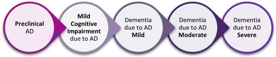 According to the International Working Group (IWG), “The diagnosis of AD is clinical-biological and requires the presence of both a specific clinical phenotype of AD and biomarker evidence of AD pathology” []. This statement makes the correct diagnosis of the disease even more difficult, as the disease is progressive and biomarkers change during years preceding the disease []. Its gradual progression covers a prolonged PC phase marked by sequential amyloid peptide and tau protein deposition, culminating in neurodegeneration preceding clinical symptomatology [,,,].