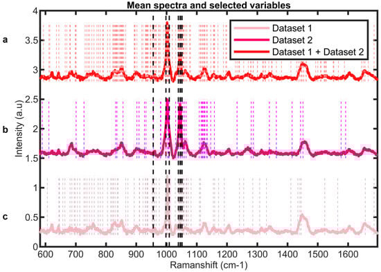 Averaged spectra and selected variables for the (a) Dataset 1 + Dataset 2 study. (b) Dataset 2 study. (c) Dataset 1 study. Dashed lines in black represent wavenumbers selected in common across all three datasets.