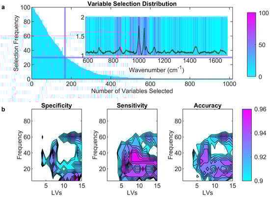 By extending the analysis, we employed an iterative approach for the variable selection procedure to increase discriminative information and reveal meaningful patterns in the frequency analysis of selected wavenumbers. Figure 3a shows the frequency distribution of selected wavenumbers over 100 iterations, which motivated the creation of machine learning models for various frequency thresholds. Figure 3b displays heat maps of figures of merit for all the created models and highlights the optimal PLS-DA model with six latent variables and wavenumbers for frequencies exceeding 30. This model achieves a remarkable AUC of 0.99 and an accuracy of 0.96 in predicting PC-AD cases, providing a competitive model for its statistically enhanced robustness and performance comparable to single cohorts. Iterative cross-validation or jackknifing improves the discrimination information extracted from the combined data.
