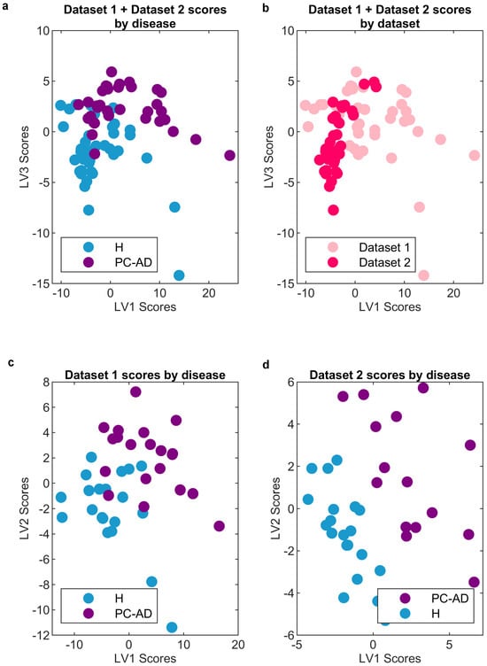 Alternatively, one could imagine constructing a model that only contains the variables that were selected together in all three data sets (Dataset 1, Dataset 2, and Dataset 1 + Dataset 2). However, the exclusive use of these selected wavenumbers, as shown in Table 1, proves to be insufficient for building machine learning models and leads to a decrease in classification performance. Various factors contribute to the selection of additional variables, especially cohort and measurement year. Figure 4 shows the model scores derived from Table 2, thereby providing a visual representation. The two-latent space depicted in the upper part of Figure 4, which includes LV1 and LV2, highlights the models’ discriminative capacity for PC-AD in both studies on Dataset 1 and Dataset 2. In particular, the color variation in the labels, as observed in the lower part of Figure 4, indicates clustering between healthy and preclinical groups, whereas the studies from Dataset 1 and Dataset 2 exhibit clustering in a different direction. This explains why more variables and model latent spaces are required when combining the studies from Dataset 1 and Dataset 2 to build a more robust and predictive model for the discrimination of PC-AD.