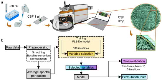 A drawback of Raman spectroscopy with biological samples is that Raman spectra often contain non-relevant signals superimposed onto interesting ones, along with a number of artifacts (e.g., baseline drifts) that make it difficult to directly interpret the Raman peaks obtained. Therefore, it is of utmost importance to analyze Raman spectra using sophisticated machine learning methods (chemometrics) and, in particular, in combination with variable selection methods to minimize artifacts, highlight important signals and be able to build reliable classification models, which have been investigated to diagnose AD in biofluidic samples [,,,,]. Most of the published research is based on limited statistics with small cohorts and, therefore, compromises the accuracy of classification and additional variable selection methods, providing limited insight into the physiological origin of classification results.