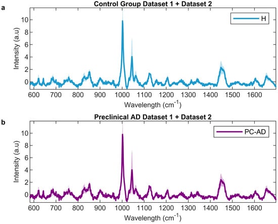 Preprocessed and averaged spectra per patient to unify both cohorts from Dataset 1 and Dataset 2; shaded area refers to the standard error. (a) Healthy or control group. (b) Preclinical Alzheimer’s subjects.