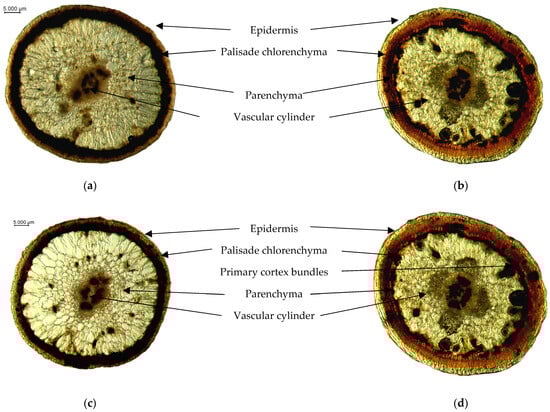 For anatomical examination, preparations were made using a microtome fitted with a TOS-2 freezing unit. These sections, with thicknesses ranging from 10 to 15 microns, were then treated with glycerin and balsam, adhering to the traditional methodologies established by Barykina []. The anatomical sections were analyzed by microphotography, utilizing a microscope equipped with an MC 300 CAMV400/1.3M camera (Micros, Vienna, Austria).