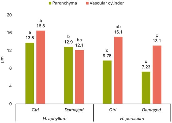 Comparative indicators of parenchyma thickness (p < 0.05) and the diameter of the vascular cylinder (p < 0.05) in middle-aged shoots of H. aphyllum and H. persicum depending on damage by gall-forming insects. Different letters within one parameter show significant difference.