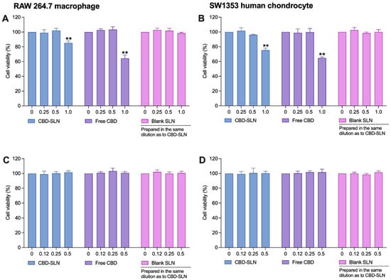2.6.1. Effects of CBD-SLNs on Cell Viability of Proinflammatory Cytokine-Stimulated Chondrocytes and Macrophages