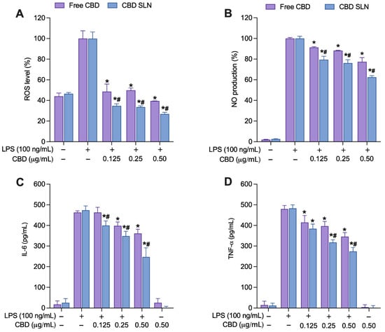 2.6.2. Effects of CBD-SLNs on the Inhibition of Cellular Free Radical Generation and Secretion of Inflammatory Components in LPS-Stimulated RAW 264.7 Macrophages