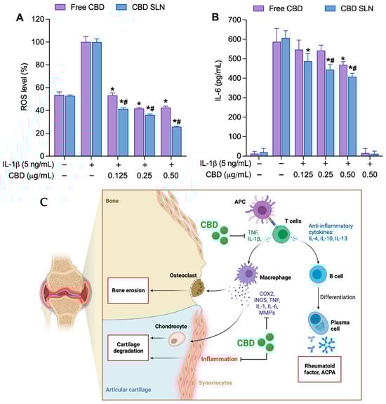 Alcantara KP, Malabanan JWT, Nalinratana N, Thitikornpong W, Rojsitthisak P, Rojsitthisak P. Cannabidiol-Loaded Solid Lipid Nanoparticles Ameliorate the Inhibition of Proinflammatory Cytokines and Free Radicals in an In Vitro Inflammation-Induced Cell Model. International Journal of Molecular Sciences. 2024; 25(9):4744. https://doi.org/10.3390/ijms25094744