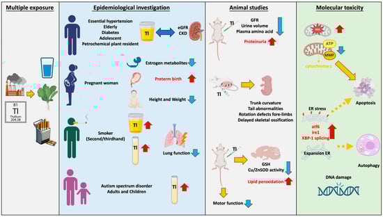Thallium emissions from smelting plants and technology manufacturing processes enter rivers through wastewater and accumulate in soil, or they enter organisms through the air. Thallium exposure pathways include drinking water, beverages, cigarettes, and vegetables. Multiple epidemiological studies have found that thallium has a significant impact on renal function, with this phenomenon observed in elderly, young, or diseased populations. Children and pregnant women are highly sensitive populations. Research has found that thallium increases the risk of premature birth and impacts child development. Due to the presence of thallium in cigarettes, smokers have higher serum thallium concentrations, which are correlated with lung damage. Furthermore, it has been found that thallium levels in urine are associated with autism. Moreover, thallium is correlated with many metabolites including thyroid hormone (T4), bilirubin levels, and 8-hydroxy-2′-deoxyguanosine (8-OHdG), and it is even associated with parameters such as body mass index (BMI) and waist circumference. The toxicity induced by thallium is extensive. Although the mechanisms of thallium toxicity are not yet fully understood, the most common is mitochondria-mediated oxidative stress. Studies using various cell lines, including hepatocytes (rat), pheochromocytoma (rat), murine hippocampal neuroblasts, and primary hippocampal neurons, have found that thallium can cause mitochondrial damage, including increased oxidative stress, changes in mitochondrial membrane potential (ΔΨm), and decreased ATP/ADP ratio, and even induce cell apoptosis. Recent studies have found that thallium can induce cell toxicity by causing endoplasmic reticulum stress, including increased expression of ATF-6 and IRE-1, XBP-1 splicing, and nuclear translocation. It is worth noting that the Nrf2-Keap1 signaling pathway, which plays an important role in the unfolded protein response, can protect against Tl (I)-induced toxicity when activated. In vitro studies have shown that thallium can induce various adverse reactions, including genetic toxicity, decreased sperm motility, and abnormal migration of immune cells. Animal studies have found consistent results with the epidemiological findings: Tl (I) reduces glomerular filtration rate (GFR), urine volume, and plasma amino acid concentrations, while increasing proteinuria, leading to renal toxicity. Additionally, it increases lipid peroxidation in the brain and impairs motor function in animals, resulting in neurotoxicity. Exposure of mice to Tl (I) during pregnancy leads to developmental defects in offspring, indicating the presence of developmental toxicity (Figure 1). However, most countries have not established limits for Tl in agricultural products, animal feed, and human food, thereby increasing the potential public health risks.