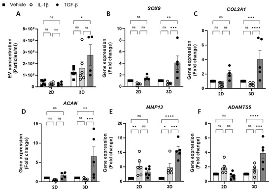 Supplementary Figure S1), we believe this is also the case in our experimental conditions. Whilst 24 h of IL-1β treatment of 2D and 3D cells had no effect on EV yield, an increase was observed in 3D cultures treated with TGF-β; a well-studied potent promoter of chondrogenesis. The importance of TGF-β is seen in conditional knockouts of