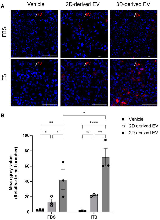 To validate this hypothesis, firstly, we confirmed the expression of β1-integrin on 3D EVs using nano-flow cytometry and, secondly, we demonstrated a reduction in 3D EV uptake after β1-integrin blockade. The involvement of β1-integrin is also functionally present when we investigated the level of EV uptake among cells cultured in FBS vs. ITS. The uptake of these EVs is greater in cells supplemented with ITS. As shown, the adhesion of these EVs is reliant on the expression of β1-integrin and its interactions with matrix components. Therefore, cells with greater chondrogenic gene expression, and hence, greater cartilage gene expression, display greater EV adhesion and uptake. However, despite the importance of the β1-integrin in focal adhesion, the binding of 3D-derived EVs to chondrocytes did not alter the cytoskeletal levels of F-actin, as quantified with phalloidin staining (