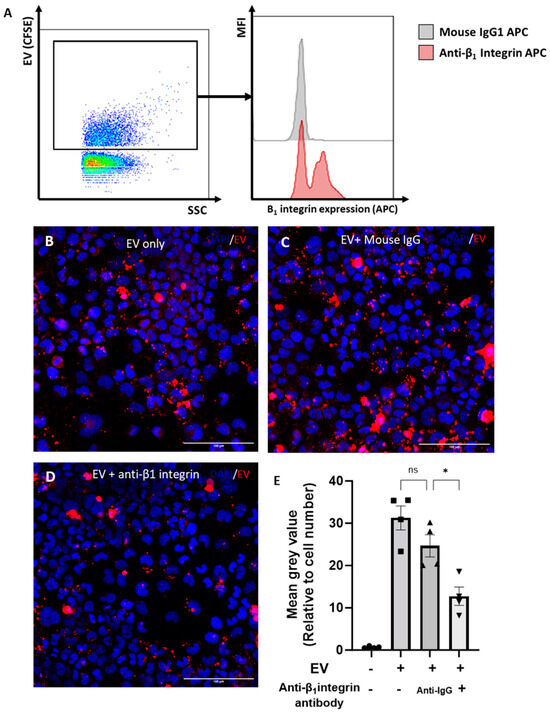 For β1-integrin expression, EVs were incubated with 4 µg/mL mouse anti-human β1-integrin APC (Clone:TS2/16; eBioscience, Altricham, UK) or IgG1 isotype control (Clone: RMG1-1; Invitrogen, Paisley, UK) in conjunction with either CFSE or BODIPY-Texas Red at 4 °C for 30 min. EVs were then washed and resuspended as described above and analysed on the nano-flow cytometer (NanoFCM, Nottingham, UK). For experiments requiring the functional blocking of β1-integrin, 15 µg/mL of mouse monoclonal anti-human β1-integrin (Clone: P5D2; R&D Systems, Minneapolis, MN, USA) or 15 µg/mL of mouse IgG1 isotype control (Clone:11711; R&D Systems, Minneapolis, MN, USA) were used.