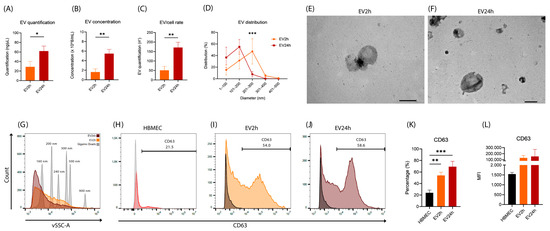 Figure 2. Extracellular vesicles isolated from cells cultured for 2 h (EV2h) and EV24h are different in size, concentration, and CD63 enrichment. EVs were obtained by differential centrifugation of the supernatant of HBMEC grown in DMEM supplemented with extracellular vesicle-depleted fetal bovine serum (EVdS) for 2 or 24 h. After isolation, indirect quantification of extracellular vesicles (EVs) was performed via fluorometry (Qubit®) (A). The size and distribution of the EVs and the particle/cell ratio were evaluated via nanoparticle tracking analysis (NTA) (BD), and the morphology of the EV2h (E) and EV24h (F) populations was evaluated via transmission electron microscopy (TEM). Quantification of EVs and evaluation of CD63 enrichment were performed by flow cytometry. A histogram for the quantification of EVs was generated based on the signals detected by violet ray scattering (vSSC-A) (G). Evaluation of CD63 enrichment was performed with the detection of a primary anti-CD63 antibody and a secondary anti-rabbit IgG antibody (H + L) conjugated to Alexa Fluor® 488 (HJ). The data obtained in (HJ) were plotted (K,L). The data were obtained from three biological replicates and are expressed as the mean ± standard deviation (simple t-test: (AC); multiple (D) and ANOVA/Tukey (K,L)); *: p-value < 0.05, **: p-value < 0.01; ***: p-value < 0.001. Scale bar, 200 nm (E,F).