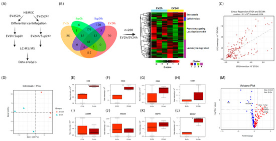 Figure 3. Extracellular vesicles isolated from cells cultured for 2 h (EV2h) and EV24h have different protein content. Extracellular vesicles (EVs) were obtained by ultracentrifugation from human brain microvascular endothelial cells (HBMECs) grown in DMEM supplemented with extracellular vesicle-depleted fetal bovine serum (EVdS) for 2 or 24 h. After isolation of the EVs, the proteins in the supernatant were precipitated with ammonium sulfate, and both the EV and the supernatant proteins were resolved on a polyacrylamide gel and analyzed using liquid chromatography–tandem mass spectrometry (LC–MS/MS) (A). The reference proteome for Homo sapiens was acquired from the UniProt database. The Boolean distribution of unique or common proteins between EVs and supernatants depleted from EVs at 2 h (Sup2h) or 24 h (Sup24h) was visualized in a Venn diagram, with 204 proteins common to both EV2h and EV24h. These proteins were normalized by the z-score and categorized on a heatmap (B). After evaluating the correlation between the EV2h and EV24h proteins using linear regression (C), the distance between replicates of EV2h and EV24h was determined by principal component analysis (PCA) constructed with 3 components (D). The raw intensities of CD9 (E), CD44 (F), CD63 (G), CD81 (H), ANXA1 (I), ANXA5 (J), SDCBP (K), and HSP70 (L) were graphically expressed in the EV2h and EV24h groups. The proteins that were differentially expressed at EV2h (left) and EV24h (right) are shown in a volcano plot (M). The data were obtained from three biological replicates. *: p-value < 0.05.