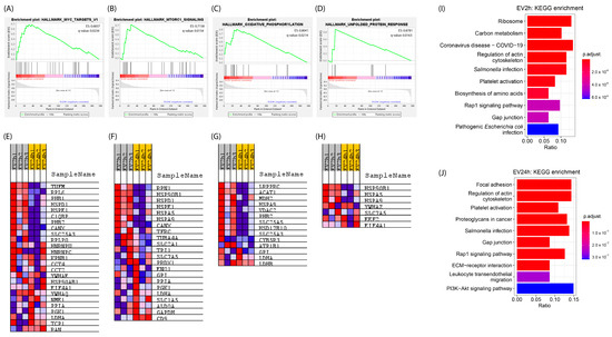 Using functional enrichment analysis (FEA), we observed the enrichment of specific pathways for proteins identified in the EV2h. We observed 25 proteins that were positively correlated (EC > 0) with the enrichment of MYC target genes (q-value = 0.0234) (Figure 4A,E), 23 related to the mechanistic target of rapamycin complex 1 (mTORC1) signaling pathway (q-value = 0.0154) (Figure 4B,F), 14 related to oxidative phosphorylation (q-value = 0.0214) (Figure 4C,G), and 7 related to the response to unfolded proteins (q-value = 0.0163) (Figure 4D,H). Proteins such as HSPs were shown to participate in multiple enrichments. No enrichment was observed for proteins identified in the EV24h (p-value and q-value > 0.05). The results of overrepresentation analysis (ORA) enrichment revealed 20 pathways with the highest enrichment for each sample group. Among the EV2h proteins, the pathways with the highest enrichment were related mainly to energy metabolism and ribosomes (Figure 4I). On the other hand, for the EV24h proteins, the highest enrichment was related to cell adhesion (focal adhesion and the Ras-related protein 1 (RAP1) signaling pathway), the cytoskeleton, and platelet activation (Figure 4J).