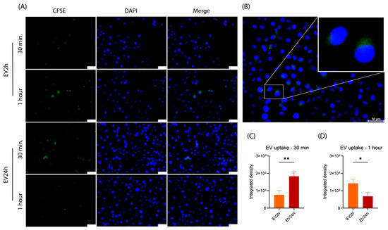 Figure 5. Extracellular vesicles isolated from cells cultured for 2 h (EV2h) and EV24h have distinct uptake ratios by HBMEC. Extracellular vesicles (EVs) were obtained from human brain microvascular endothelial cells (HBMECs) previously labeled with CFSE (green) and cultured in DMEM supplemented with EV-depleted FBS (EVdS). EVs were isolated through differential centrifugation. HBMECs were cultured in 24-well plates and incubated with EV2h or EV24h at a concentration of 100 ng/mL for 30 min or 1 h. Subsequently, the cells were washed, fixed with 4% paraformaldehyde, stained with DAPI (blue), and evaluated under a fluorescence microscope (A). Artificially enlarged image of EV2h uptake (B). The obtained images were analyzed using specific software, and the percentages of EVs taken up within 30 min (C) and 1 h (D) are expressed as the integrated density. The data were obtained from three biological replicates with five technical replicates and are presented as the mean ± standard deviation (t-test); *: p < 0.05, **: p < 0.01. The scale bar represents 50 μm (A,B).