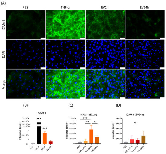 Figure 6. The expression of intercellular adhesion molecule 1 (ICAM-1) on human brain microvascular endothelial cells (HBMECs) is modulated by extracellular vesicles (EVs). EVs were obtained from HBMEC cultured in DMEM supplemented with EV-depleted FBS (EVdS) by differential centrifugation. HBMEC were grown in 24-well plates and incubated with EV2h, EV24h (100 ng/mL), TNF (10 ng/mL), or PBS for 24 h. A second experiment was conducted with cells incubated with extracellular vesicles isolated from cells cultured for 2 h (EV2h) or EV24h at concentrations of 0.01, 0.1, or 1.0 μg/mL. Following the incubation, both groups of cells were washed, fixed with 4% paraformaldehyde, and then incubated with a primary anti-ICAM-1 antibody. Subsequently, a secondary anti-mouse IgG antibody (H+L) conjugated to Alexa Fluor® 488 was applied (green), and the cells were stained with DAPI (blue). The cells were then evaluated under a fluorescence microscope (A). The obtained images were analyzed using specific software, and comparisons between EV2h and EV24h (B) and between different concentrations of EV2h (C) or EV24h (D) are expressed as the integrated density. The data were obtained from three biological replicates with five technical replicates each and are presented as the mean ± standard deviation (ANOVA/Tukey). Statistical significance was determined as follows: *: p-value < 0.05; **: p-value < 0.01; and ***: p-value < 0.001. Scale bar, 50 μm (A).