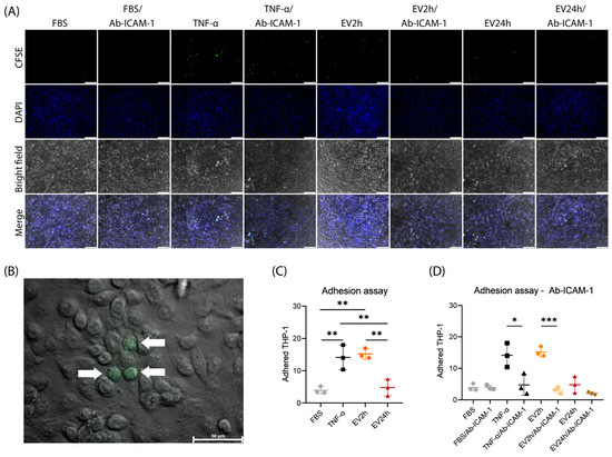 Figure 7. Adhesion of THP-1 cells to human brain microvascular endothelial cells (HBMECs) stimulated with extracellular vesicles (EVs) is modulated by intercellular adhesion molecule 1 (ICAM-1). EVs were obtained from HBMEC grown in RPMI supplemented with extracellular vesicle-depleted fetal bovine serum (EVdS) using a differential centrifugation method. HBMECs were grown in 24-well plates and incubated with EVs isolated from cells cultured for 2 h (EV2h) or EV24h (100 ng/mL), TNF (10 ng/mL), or PBS for 24 h (A). Another group of cells was subsequently incubated for 1 h with specific antibodies against ICAM-1 (Ab-ICAM-1) and washed with PBS to remove unbound antibodies. THP-1 cells maintained in RPMI were labeled with CFSE (green) and cocultured with HBMEC at a 1:1 ratio for 1 h. The cells were then sequentially washed, fixed with 4% paraformaldehyde, stained with DAPI (blue), and evaluated under a fluorescence microscope (B). The 400× magnified image shows THP-1 cells (arrows) adhered to HBMEC (B). The adherend THP-1 cells in the absence (C) or presence (D) of Ab-ICAM-1 were counted, and the results are expressed graphically. The data were obtained from three biological replicates and five technical replicates and are expressed as the mean ± standard deviation [ANOVA/Tukey (C) t-test (D)]; *: p-value < 0.05; **: p-value < 0.01; ***: p-value < 0.001. The scale bar represents values of 100 μm (A) and 50 μm (B).
