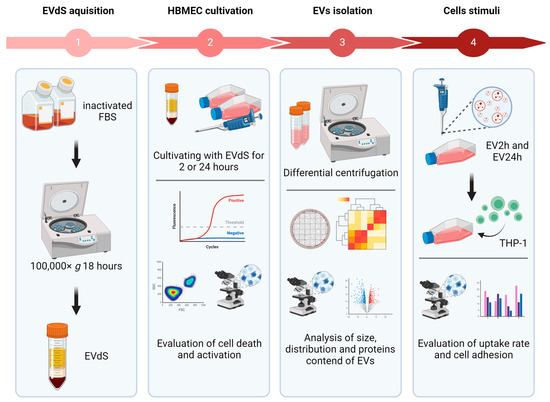 Figure 8. Experimental flowchart. Extracellular vesicle-depleted fetal bovine serum (EVdS) was obtained by centrifugation at 100,000× g (1). Afterward, the human brain microvascular endothelial cells (HBMECs) were cultured with EVdS for 2 or 24 h; cell death and activation were assessed by flow cytometry and quantitative PCR (qPCR) (2). EVs isolated from cells cultured for 2 h (EV2h) and EV24h were obtained by differential centrifugation, and their size, concentration, and protein content were evaluated by transmission electron microscopy (TEM), nanoparticle tracking analysis (NTA) and liquid chromatography–tandem mass spectrometry (LC–MS/MS) (3). HBMECs were incubated with EV2h or EV24h to evaluate the uptake rate, expression of adhesion molecules, and adhesion to human acute monocytic leukemia cell line (THP-1) cells (4). Figure created with https://help.biorender.com/en/ accessed on 6 April 2024.