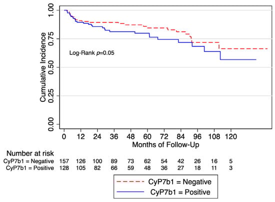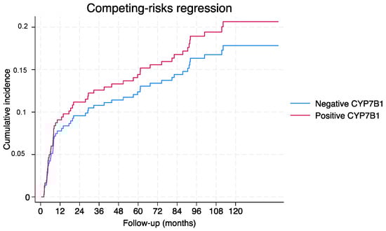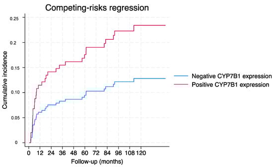 Overall, the competing risk analysis did not demonstrate any statistically significant association between CYP7B1 (subhazard ratio (SHR): 1.18; p = 0.55) and age (SHR: 0.99; p = 0.64), but did demonstrate a positive association with pathological stage (pT3/4 vs. pT2) (SHR: 1.80; 95%CI 1.00–3.29; p < 0.05) and ISUP Gleason (≥4 vs. <4) (SHR: 2.44; 95%CI 1.17–5.08; p < 0.05). Figure 2 shows the cumulative incidence function for BCR according to CYP7B1 expression.