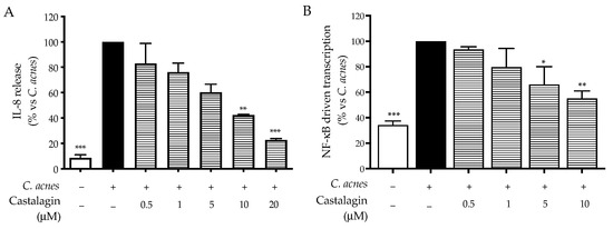 Piazza, S.; Martinelli, G.; Maranta, N.; Pozzoli, C.; Fumagalli, M.; Nicolaci, V.; Sonzogni, E.; Colombo, L.; Sangiovanni, E.; Dell’Agli, M. Investigation into the Anti-Acne Effects of Castanea sativa Mill Leaf and Its Pure Ellagitannin Castalagin in HaCaT Cells Infected with Cutibacterium acnes. Int. J. Mol. Sci. 2024, 25, 4764. https://doi.org/10.3390/ijms25094764