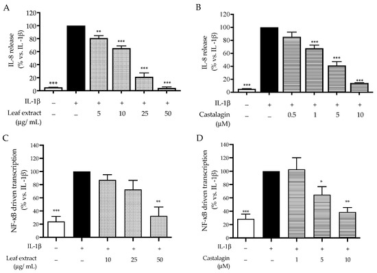 - Piazza, S.; Martinelli, G.; Fumagalli, M.; Pozzoli, C.; Maranta, N.; Giavarini, F.; Colombo, L.; Nicotra, G.; Vicentini, S.F.; Genova, F.; et al. Ellagitannins from Castanea sativa Mill. Leaf Extracts Impair H. pylori Viability and Infection-Induced Inflammation in Human Gastric Epithelial Cells. Nutrients 2023, 15, 1504. [Google Scholar] [CrossRef] [PubMed]