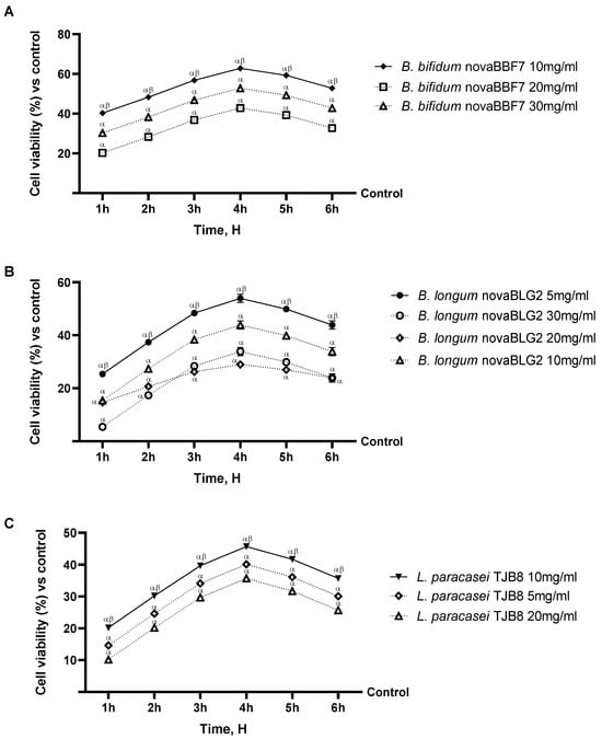 Dose–response study on CaCo-2 cells for assessment of cell viability. In (A), cell viability measured by MTT on CaCo-2 after treatment with B. bifidum novaBBF7 at different concentrations; in (B), cell viability measured by MTT on CaCo-2 after treatment with B. longum novaBLG2 at various concentrations; and in (C), cell viability measured by MTT on CaCo-2 after treatment with L. paracasei TJB8 at different concentrations. Data are expressed as mean ± SD (%) of 5 independent experiments normalized to control to represent a percentage increase in cell viability after treatments compared to the control (0% line). All probiotic strains were p < 0.05 vs. control; α p < 0.05 vs. control; β p < 0.05 vs. other concentrations.