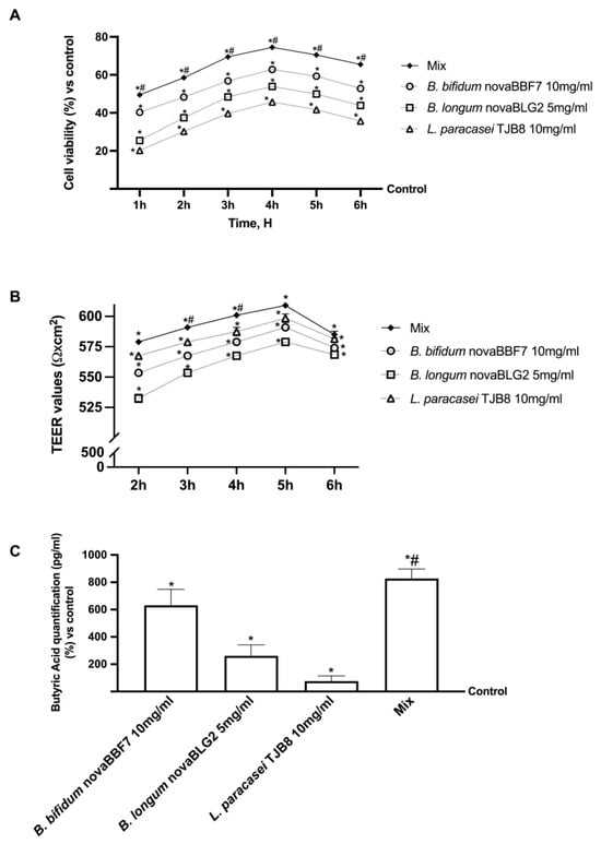 Safety analysis on intestinal in vitro model. In (A), cell viability assessed by MTT was evaluated; in (B), TEER analysis was performed; and in (C), butyric acid quantification assessed by an ELISA Kit was reported. Mix = B. bifidum novaBBF7 10 mg/mL + B. longum novaBLG2 5 mg/mL + L. paracasei TJB8 10 mg/mL. Data are expressed as mean ± SD (%) of 5 independent experiments normalized to control. * p < 0.05 vs. control; # p < 0.05 vs. single agents.