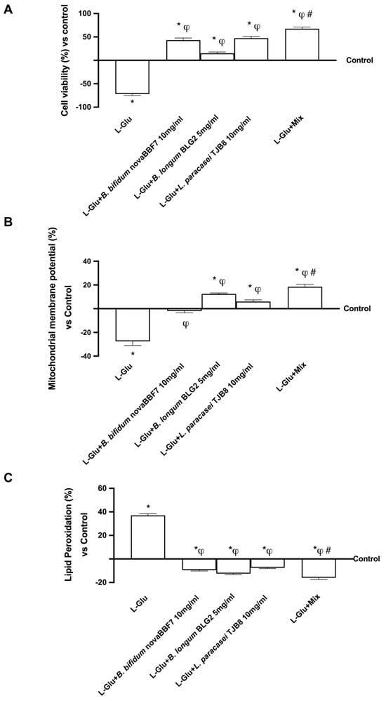 Biological effects of probiotic metabolites on SHSY-5Y in the condition of mood disorders. In (A), cell viability was evaluated by the MTT test; in (B), mitochondrial membrane potential was analyzed by JC-1 probe; and in (C), lipid peroxidation was analyzed by MDA ELISA Kit. L-Glu = L-Glutamate 5 mM; Mix = B. bifidum novaBBF7 10 mg/mL + B. longum novaBLG2 5 mg/mL + L. paracasei TJB8 10 mg/mL. Data are expressed as mean ± SD (%) of 5 independent experiments normalized to control. * p < 0.05 vs. control; φ p < 0.05 vs. L-Glu; # p < 0.05 vs. single agents.